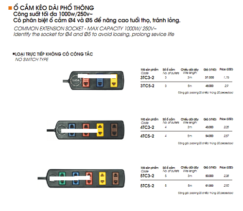 Ổ cắm điện lioa 2 lỗ là ổ cắm loại phổ thông. Có chiều dài đa dạng như 3m, 5m, 10m. Ổ cắm điện lioa 2 lỗ cũng có khá đa dạng. Như loại 3 chấu, 6 chấu, 12 chấu. Có loại còn có công tắc và cầu chì bảo vệ.